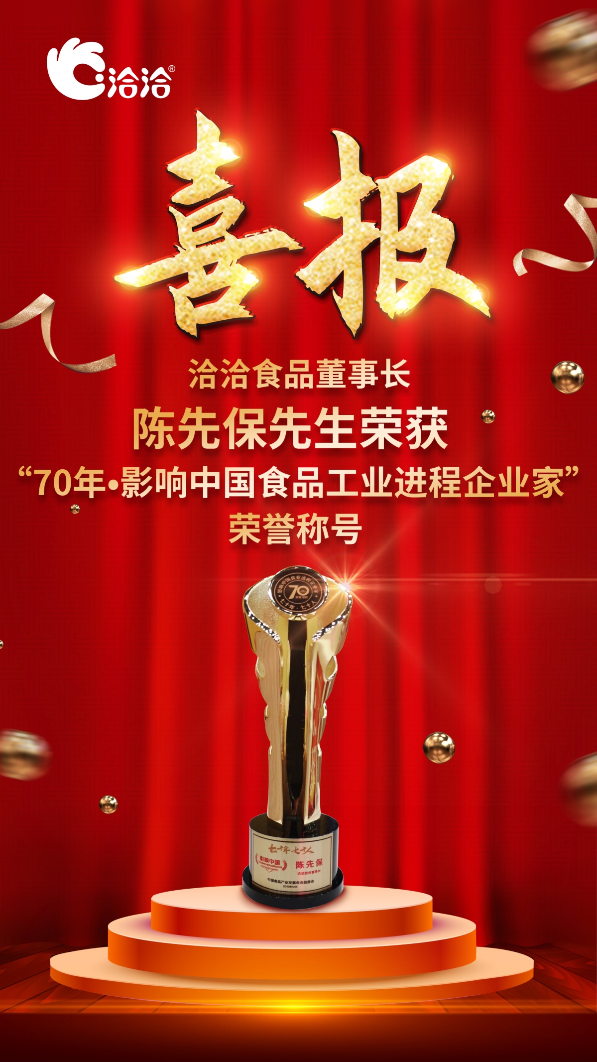 12月6日,“榮耀七十年·走進(jìn)新時(shí)代——2019中國(guó)食品產(chǎn)業(yè)發(fā)展年會(huì)暨2019(第四屆)華糖萬商領(lǐng)袖大會(huì)”在鄭州隆重召開。70年?食業(yè)改變中國(guó),為表彰致敬70年來為中國(guó)食品工業(yè)做出杰出貢獻(xiàn)的企業(yè)家,大會(huì)開展了“70年?70人——全民推選影響中國(guó)食品工業(yè)進(jìn)程企業(yè)家”評(píng)選活動(dòng),眾多全國(guó)食品工業(yè)領(lǐng)域的杰出企業(yè)家成為推選人物。最終通過全民票選,洽洽董事長(zhǎng)陳先保先生獲頒“70年?影響中國(guó)食品工業(yè)進(jìn)程企業(yè)家”榮譽(yù)稱號(hào)。 榮耀70年,走進(jìn)新時(shí)代!奮戰(zhàn)20年,展望未來,